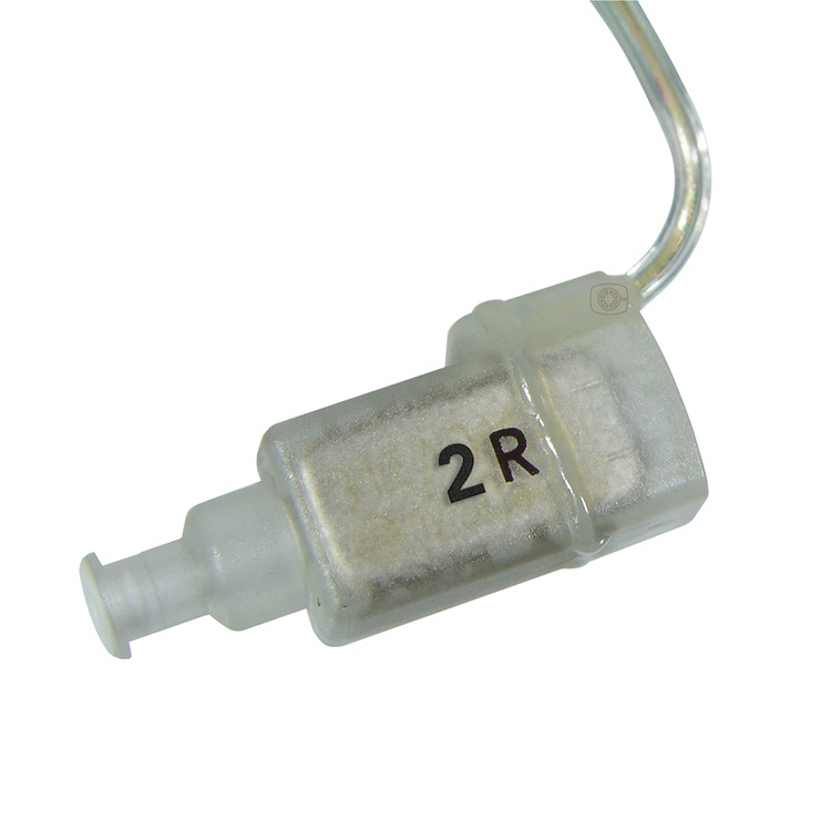 The Oticon RITE MiniFit receivers are supplied in left and right variants as well as different lengths. The left ear units have an L followed by the size denoted by a number and right ear units have an R followed by the size denoted by a number. The power level of your receiver is indicated by a coloured square - this 100 P MiniFit receiver speaker has a P and 100 in a black square, on the other side is R2 for right ear size 2.
