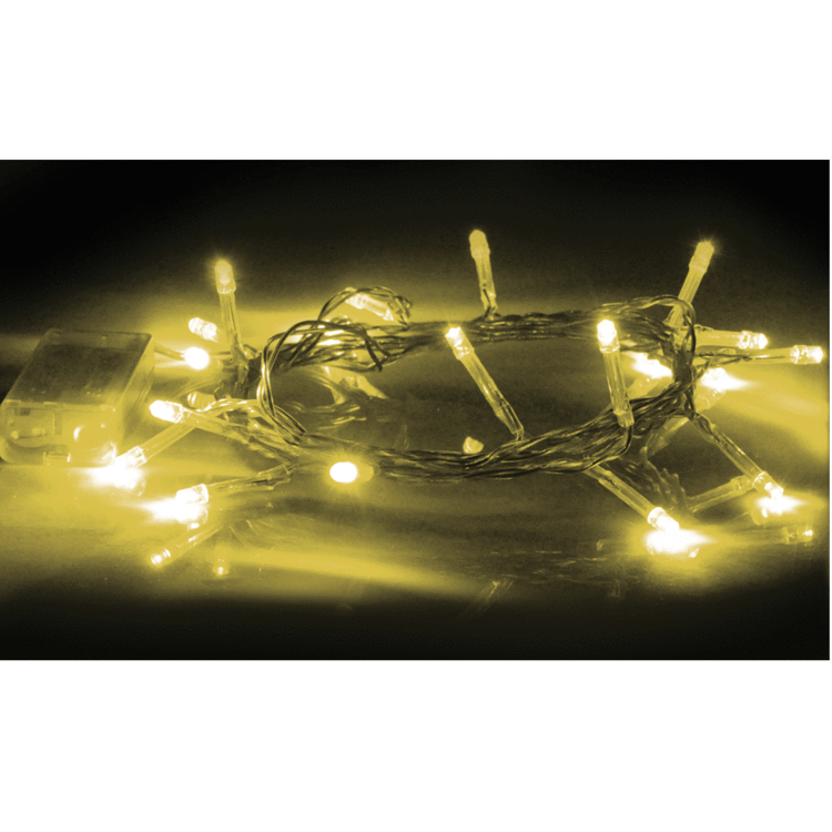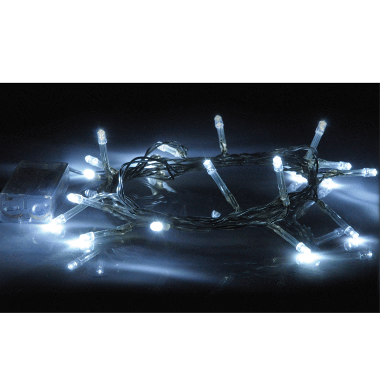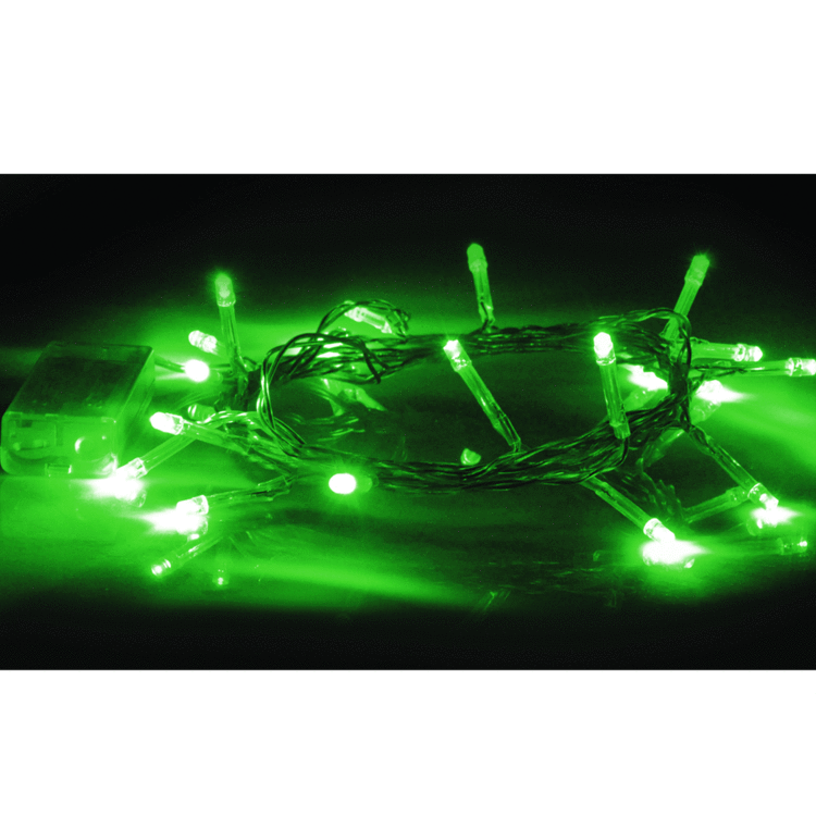 The LED String Lights are not recommended for use outdoors. There are 20 LED bulbs, spaced 10 cm apart. Each bulb is 35 mm tall and just 4 mm wide. The overall length is 275 cm, with a lead of 80 cm from the battery unit to the first LED bulb.