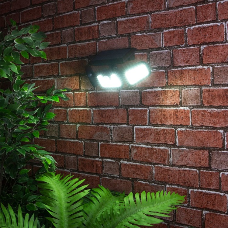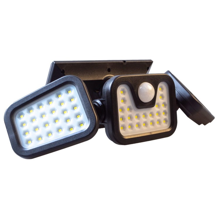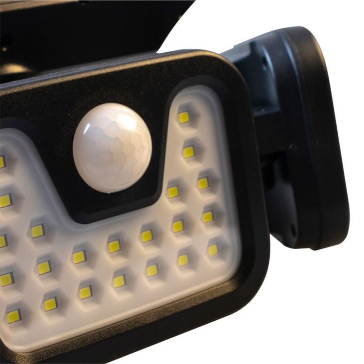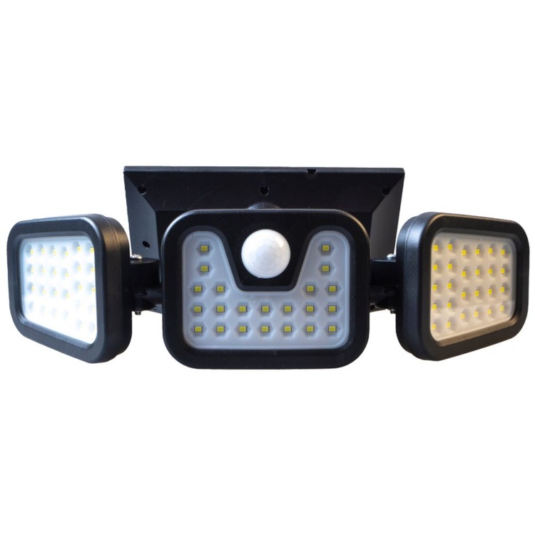 The St Helens Home and Garden solar powered motion sensor security light has 3 heads and gives a 400 lumen illumination. The outer heads have 26 LEDs and the middle head has 22. The outer heads can be angled to focus light wherever it is needed.