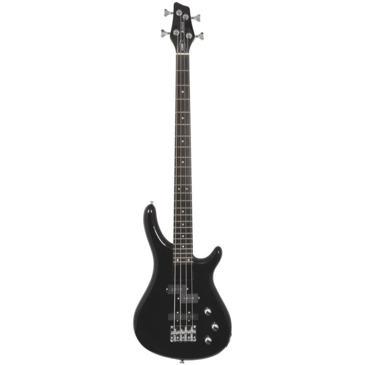 The CCB90 black electric bass guitar is our contemporary electric bass and benefits from a compact, contoured basswood body with a bolted deep cut joint to its maple neck. The HPL fingerboard holds 24 frets and the ultra-compact headstock is home to 4 closed geared tuners. A single coil and split humbucking pickups are controlled by 2 volumes and a single tone rotary.
