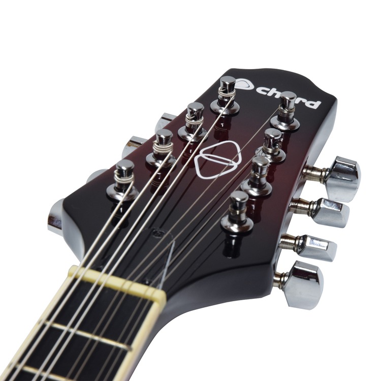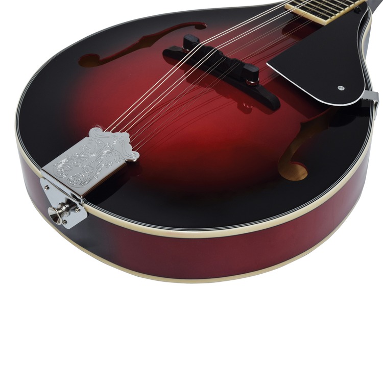 A traditional teardrop-style mandolin with a linden body and neck, and a kabukalli fingerboard. A floating adjustable bridge is fed from the loop-end strung tailpiece and tuning is handled by 2 rows of 4 open-geared tuning machine heads.