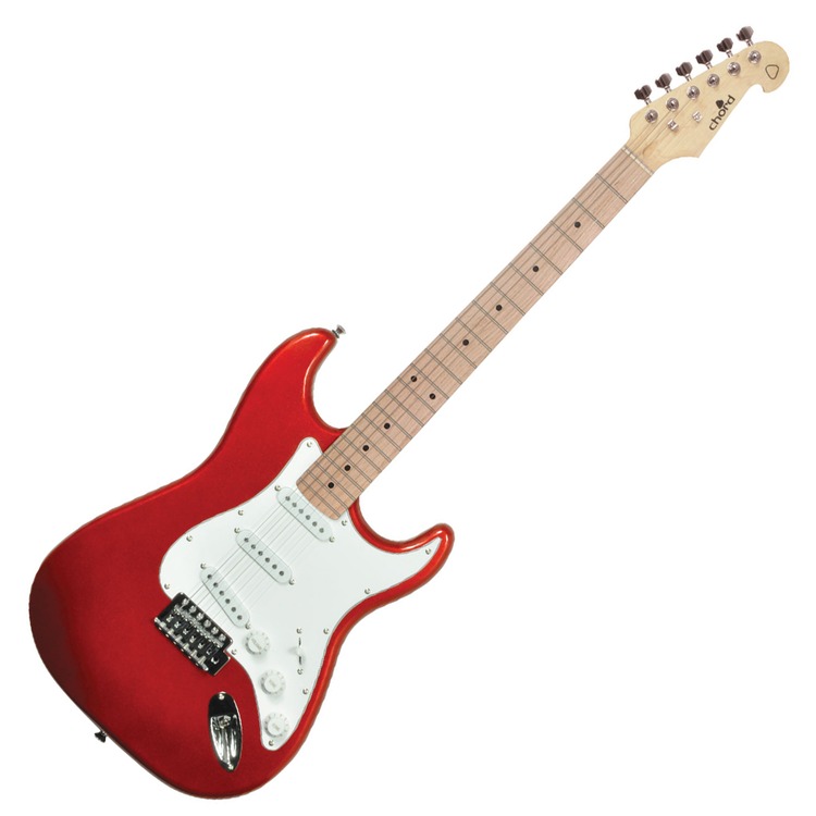 The CAL63M Metallic Red Electric Guitar is a traditionally styled standard electric guitar with 3 single coil pickups. The 22 fret maple neck with maple fingerboard is bolted to the contoured basswood body.