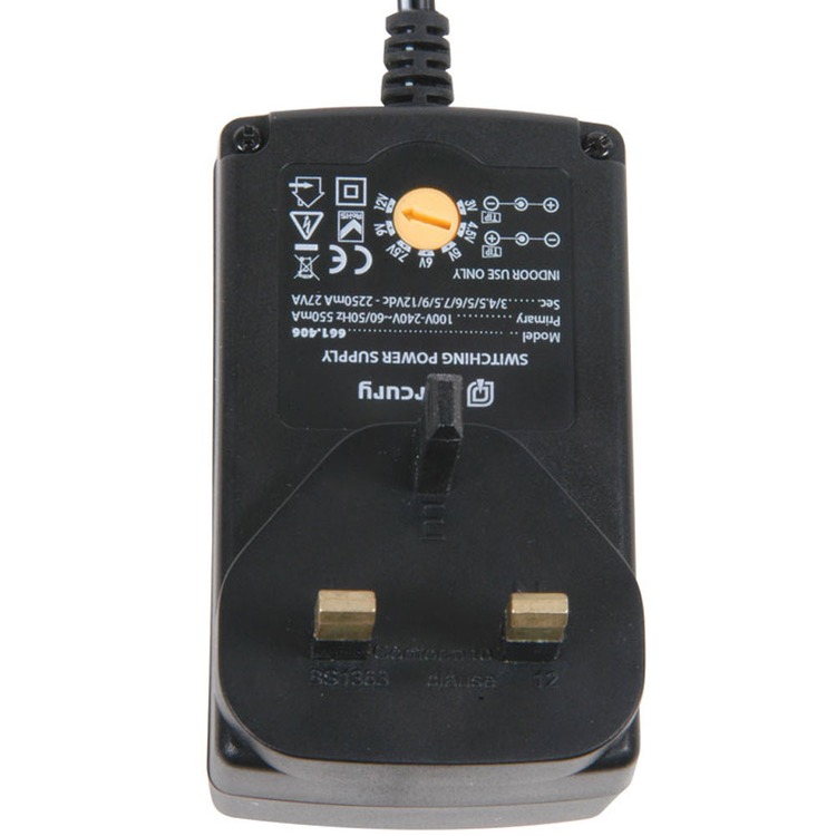 This compact, energy efficient switch-mode power supply gives up to 2250mA with a variable output from 3V to 12V. Suitable for most low power electronic products such as MP3 players, PDA etc.