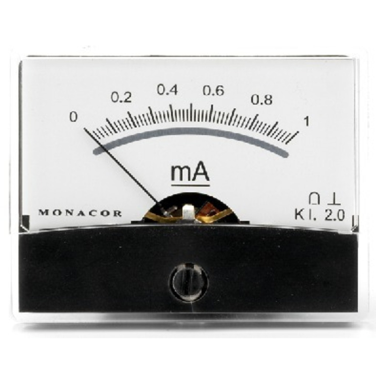 A 1mA dc moving coil meter with wide angle, mirrored scale and zero adjustment.