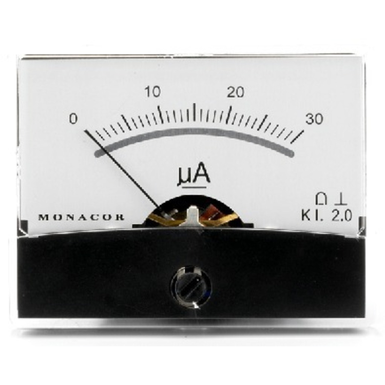 A 30uA dc moving coil meter with wide angle, mirrored scale and zero adjustment.