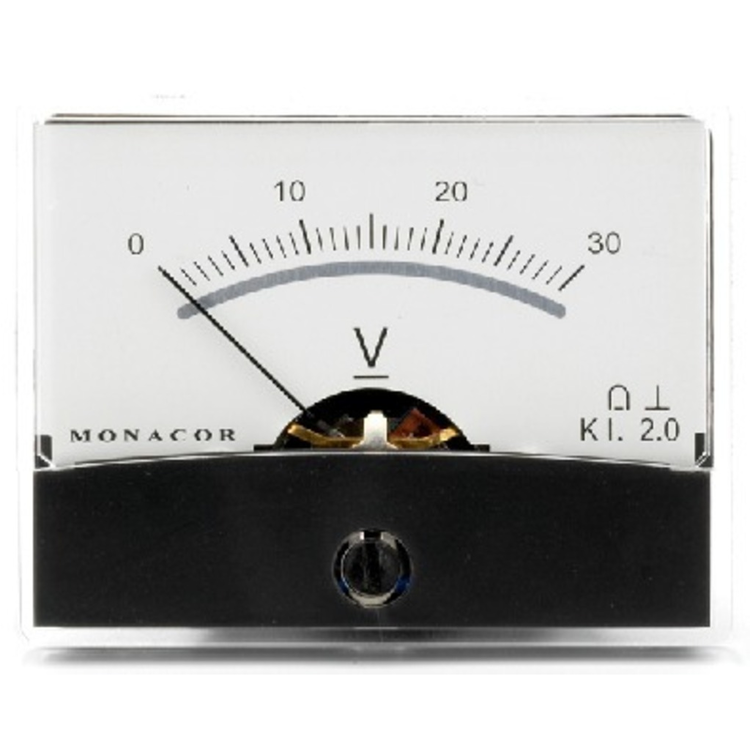 A 30V dc moving coil meter with wide angle, mirrored scale and zero adjustment.