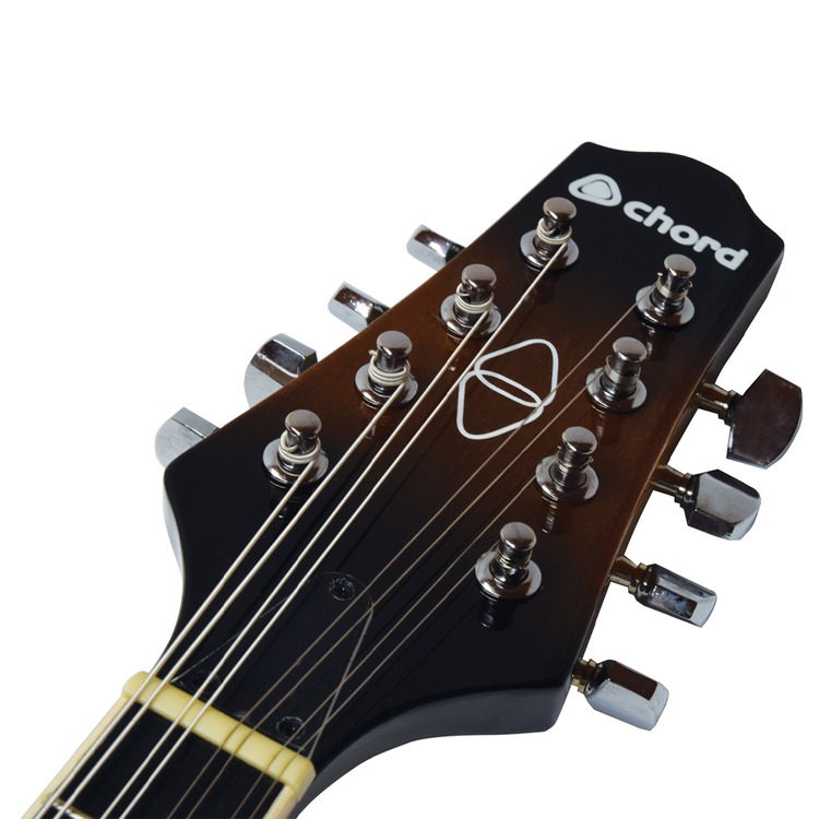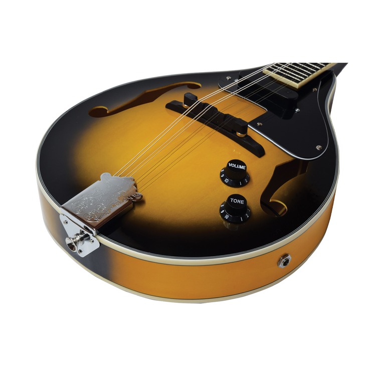 A electric teardrop-style mandolin with a linden body and neck, and a kabukalli fingerboard. Single coil pickup with volume and tone controls. A floating adjustable bridge is fed from the loop-end strung tailpiece and tuning is handled by 2 rows of 4 open-geared tuning machine heads.